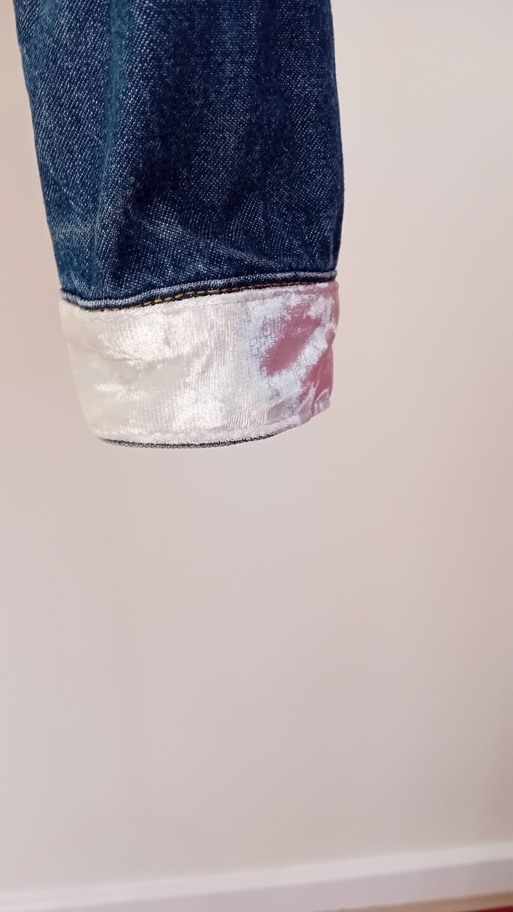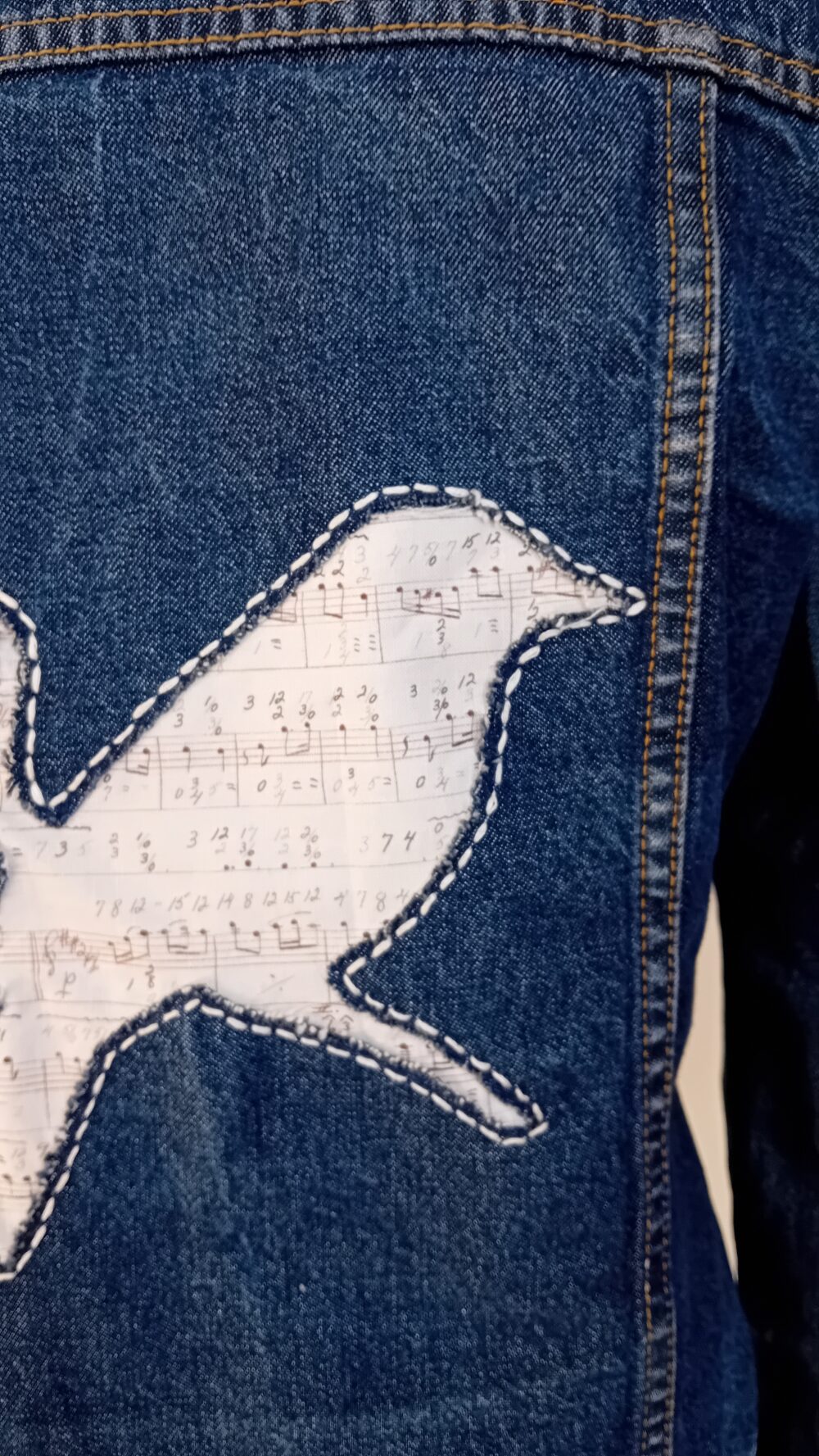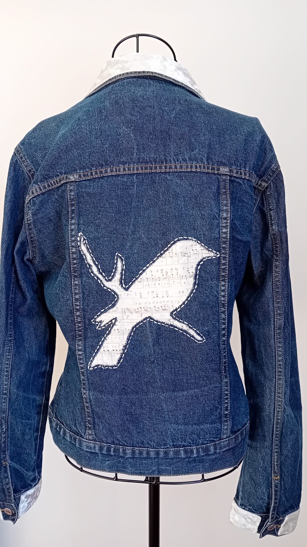 Cut-out bird on a branch on back of jacket, backed with musical score fabric and cream outline embroidery. Cuffs and collar all finished in cream velvety fabric.