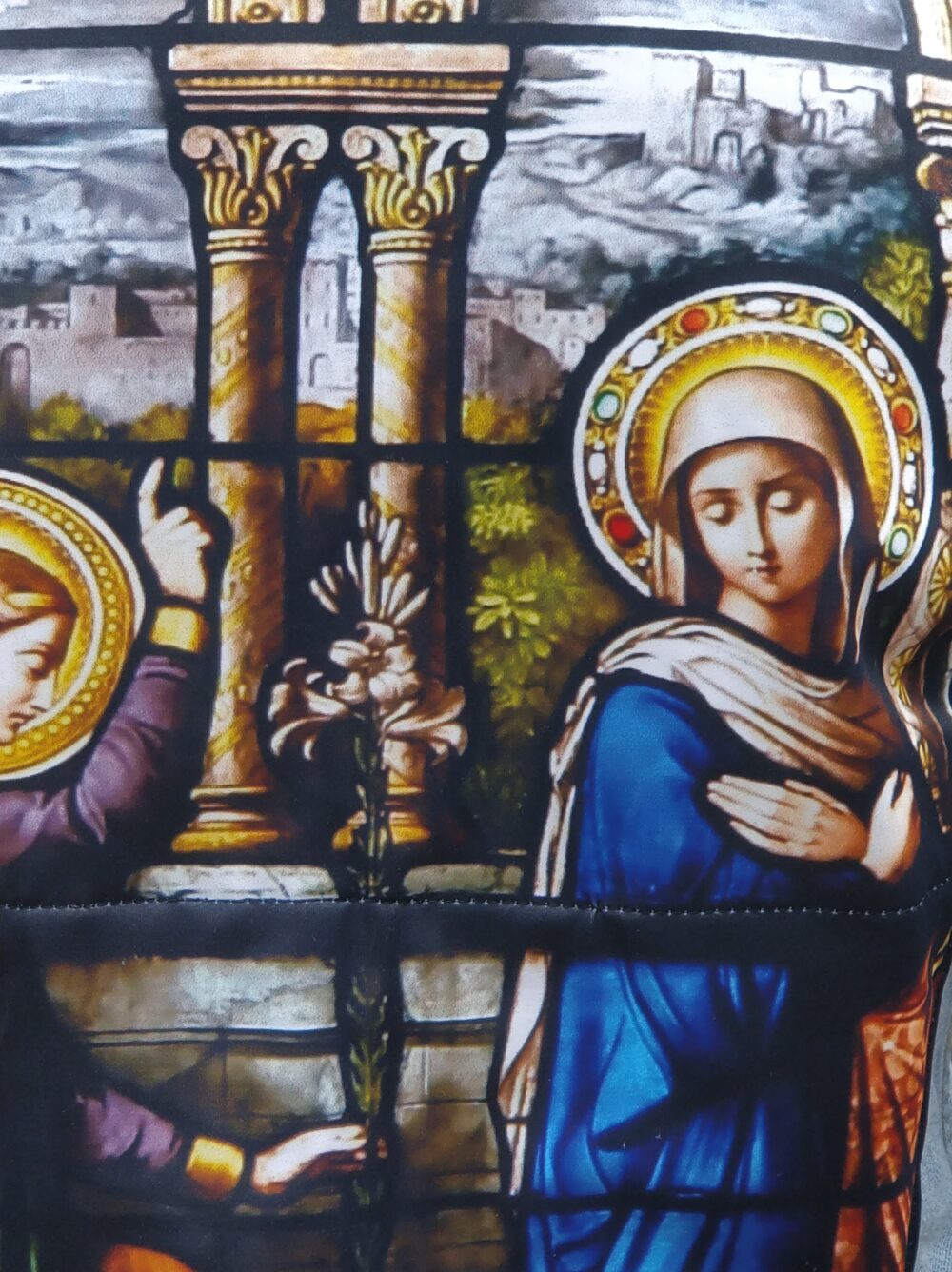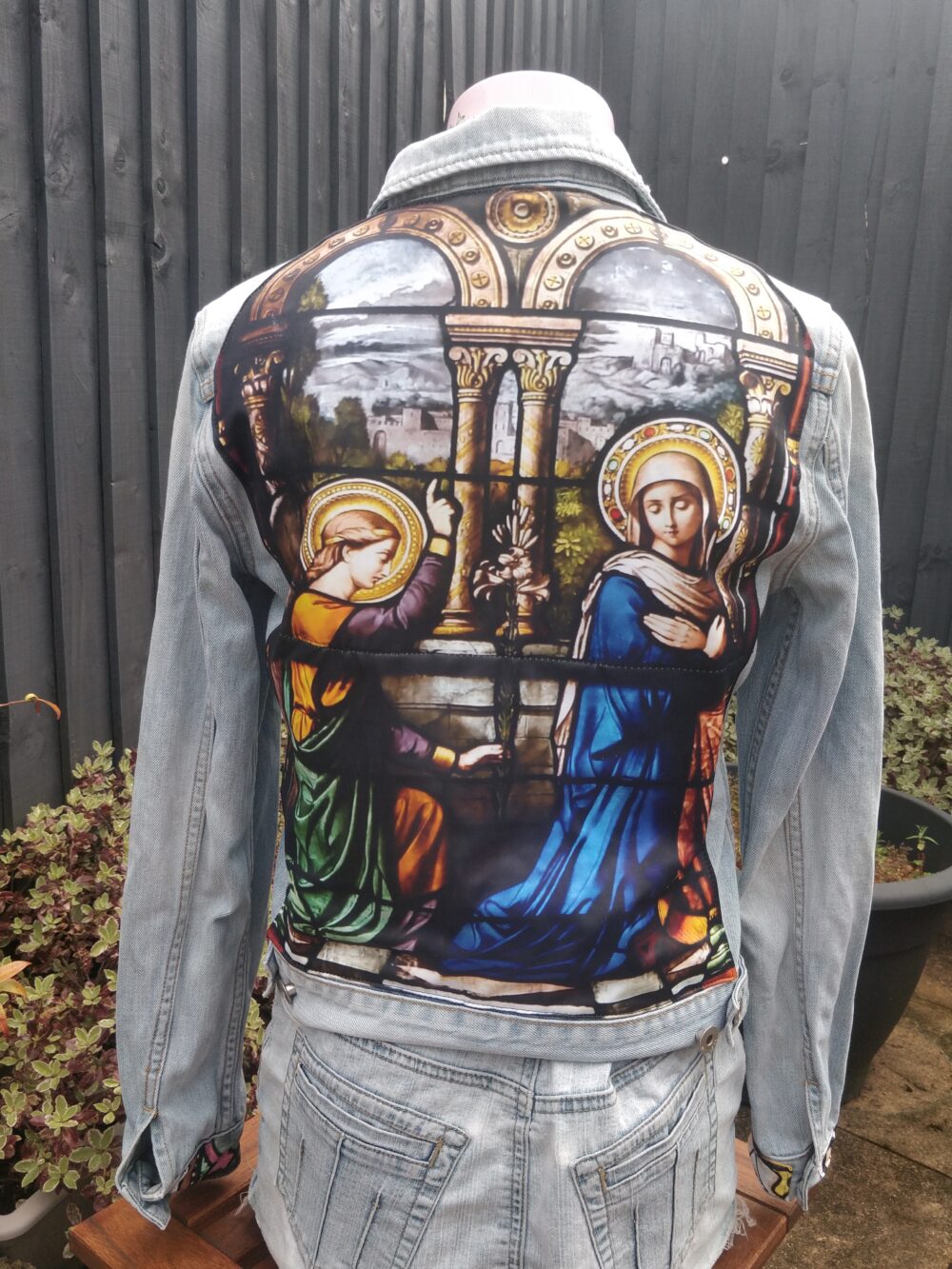Beautiful image of stained glass window in church showing the Annunciation on whole back of jacket. Same colourful fabric on the cuffs.